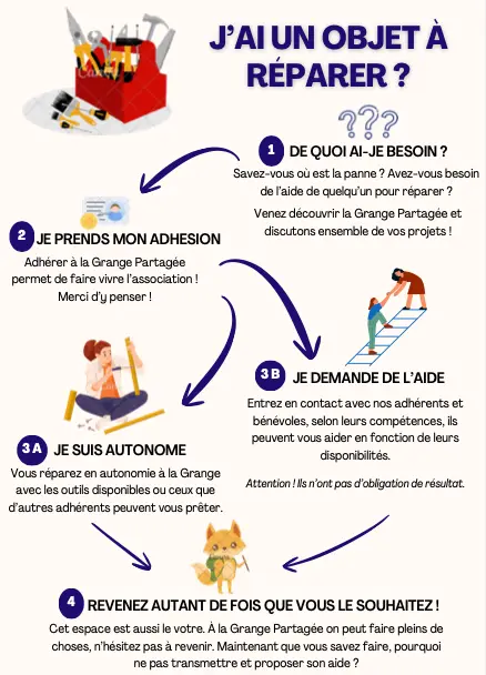 La Grange Partagée est un lieu, où vous pouvez venir bricoler, créer, réparer, donner un coup de main ou vous faire aider. Ce grand local héberge pas mal d'outils, du bois, des matériaux, etc. Vous pouvez aussi rencontrer nos adhérents, emprunter leurs objets et bénéficier de leurs conseils. Ici, on s'entraide !